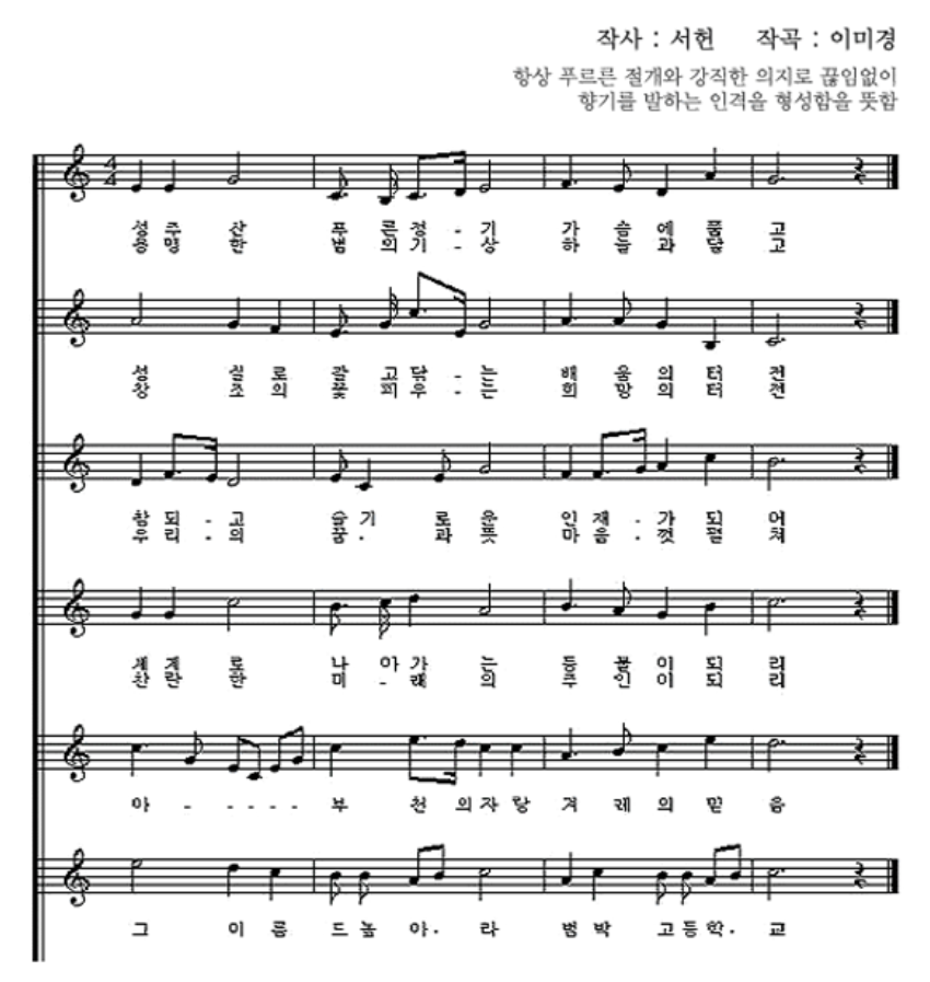 천 년을 살고 천 년을 보낸다는 주목 같은 범박인의 영원한 기상과 명예를 상징함, 줄기찬 노력으로 자아완성(自我完成)에 정진(情進)하고 무궁(無窮)한 발전을 지향하는 학생이 되자.
