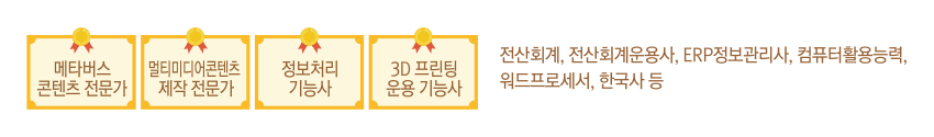 • 취업 : 메타버스 콘텐츠 개발업체,웹/앱개 개발 및 관리자,IT 관련 사무직,대기업,중소·강소기업 경영·회계부서,금융기관,육군·해군·공군·해병대·특전사부사관 등
