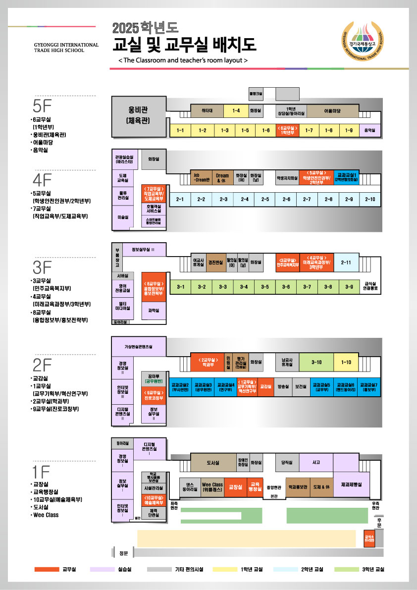 • 1F: 교장실, 교육행정실, 10교무실(예술체육부), 도서실, Wee Class