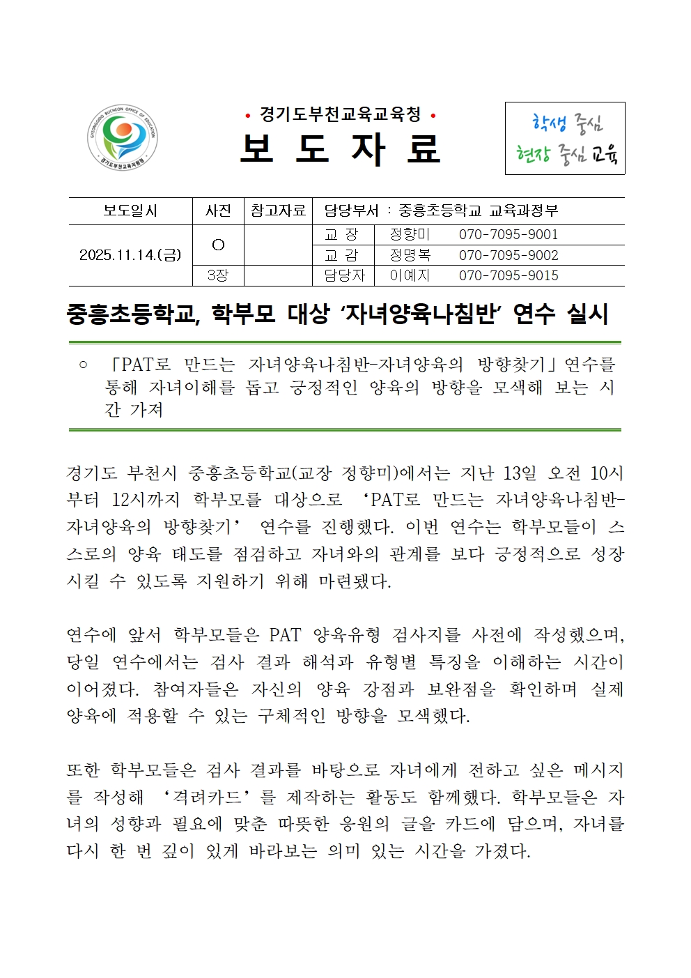 중흥초등학교, 학부모 대상 ‘자녀양육나침반’ 연수 실시