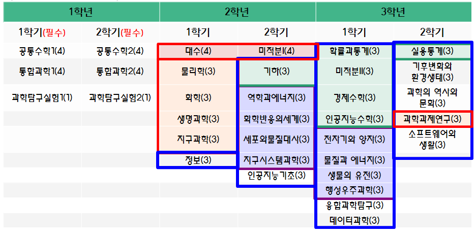 - 3년간 과학·수학·정보 교과에서 총 교과 이수 단위 45%(79학점) 이상 이수